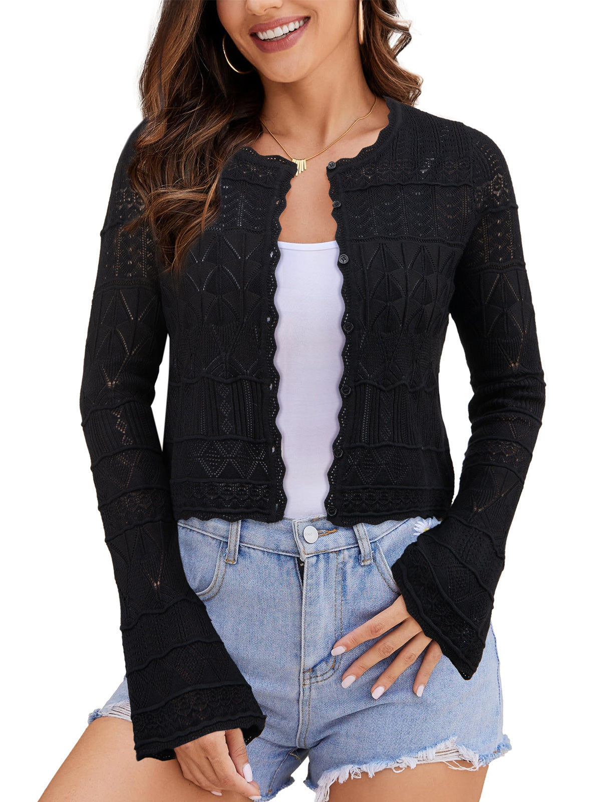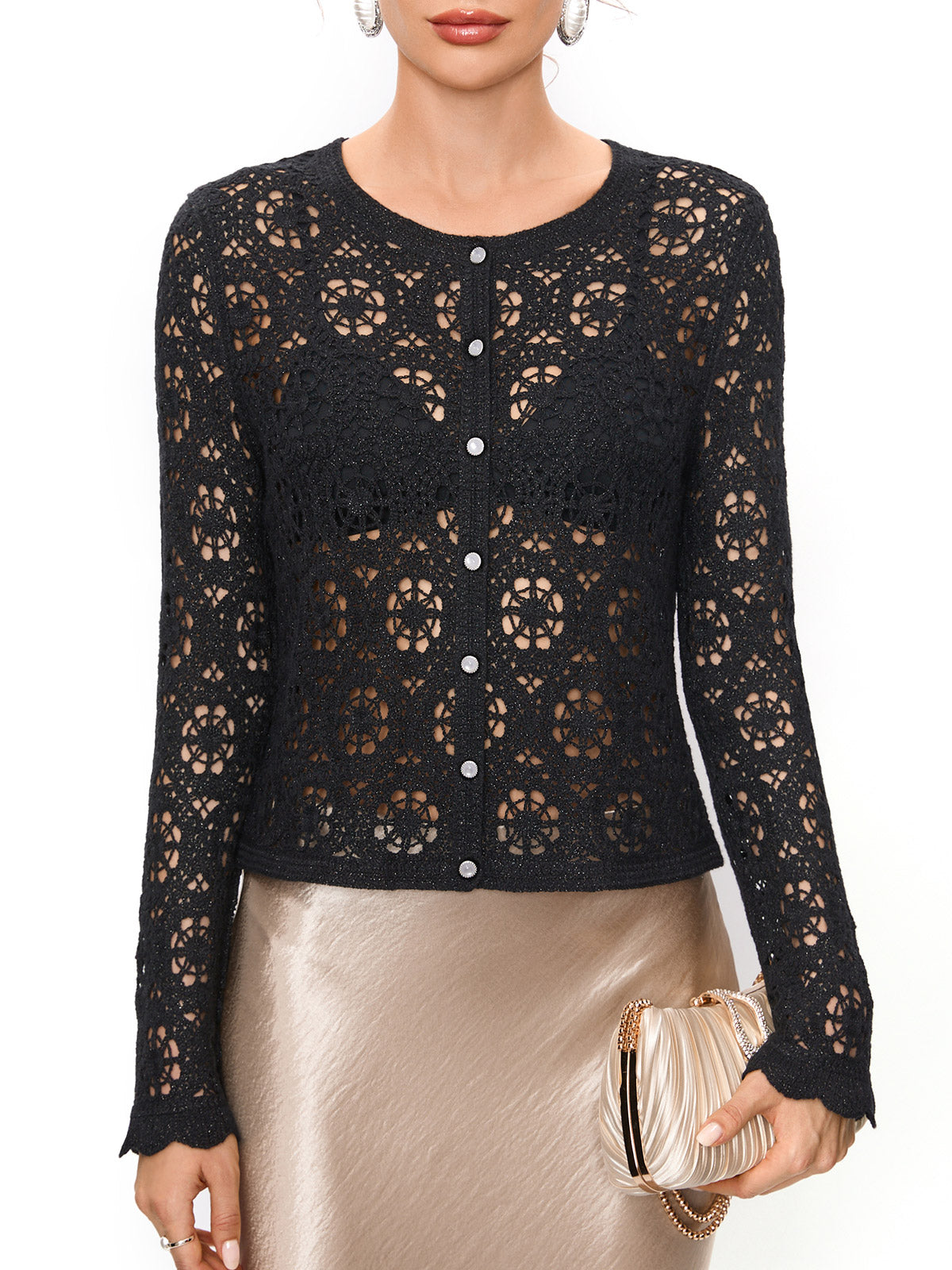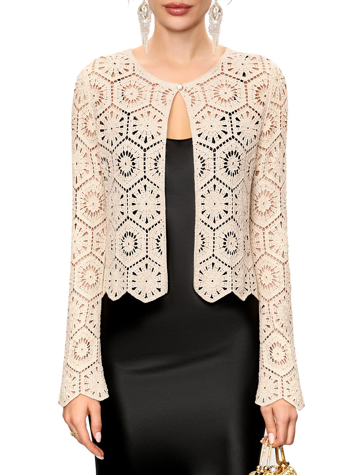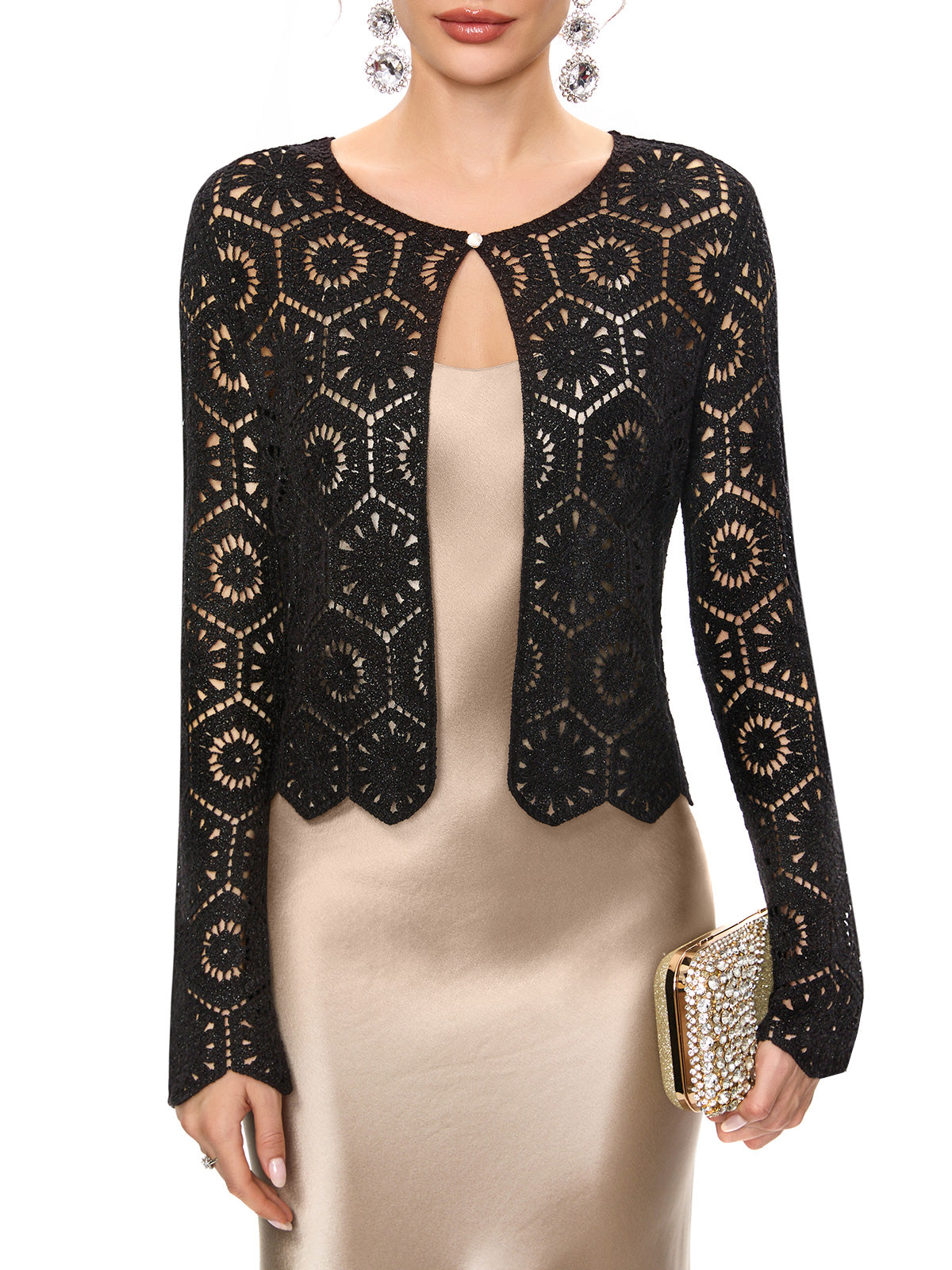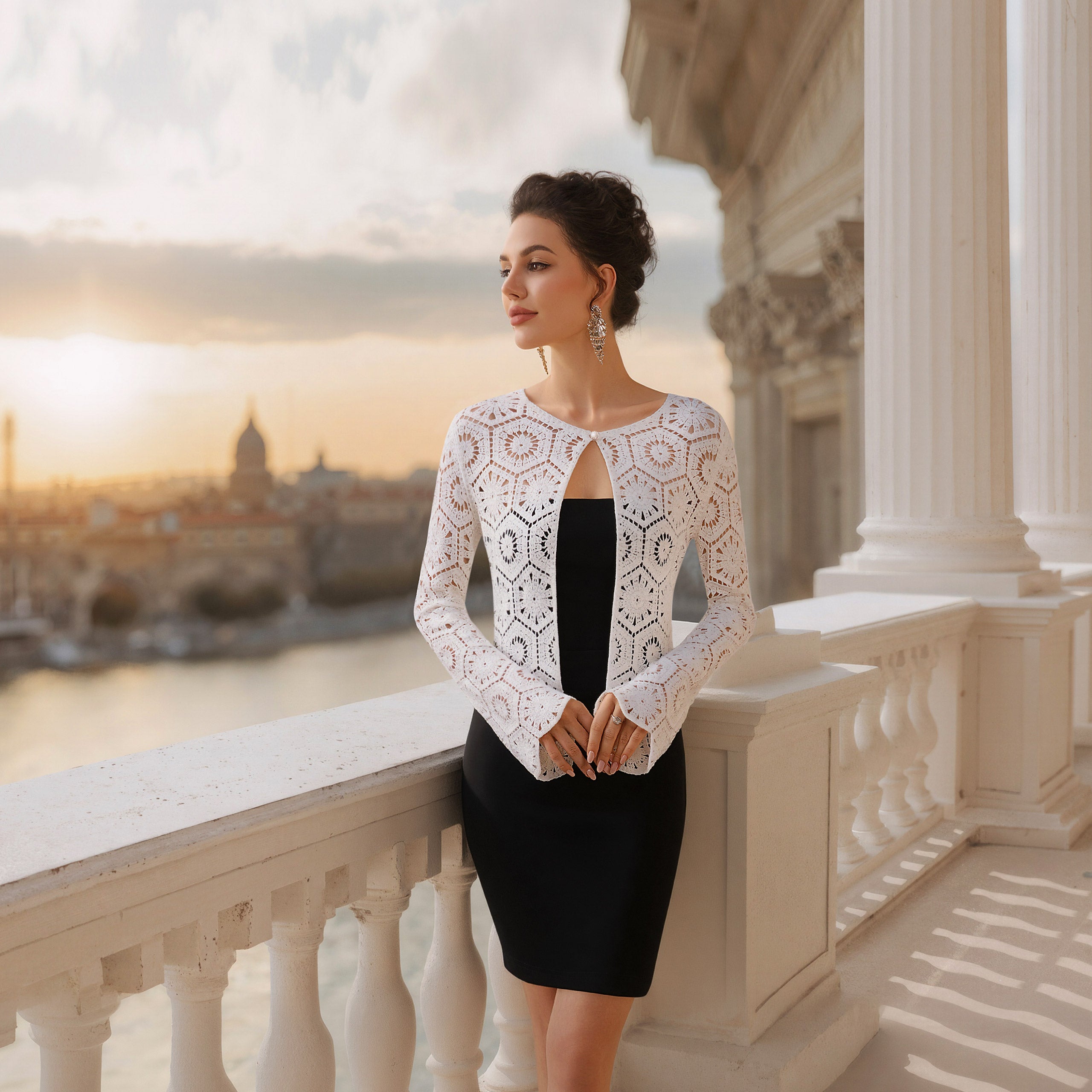 My wife absolutely loves this cardigan. The crochet design looks even better in person, elegant and detailed without being over the top. The little golden thread running through it gives it just the right amount of shimmer, perfect for dressy occasions but not too flashy.