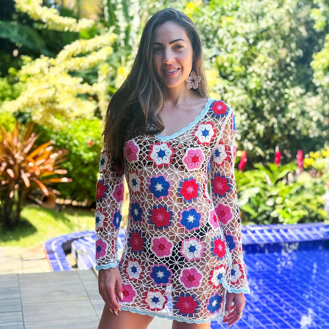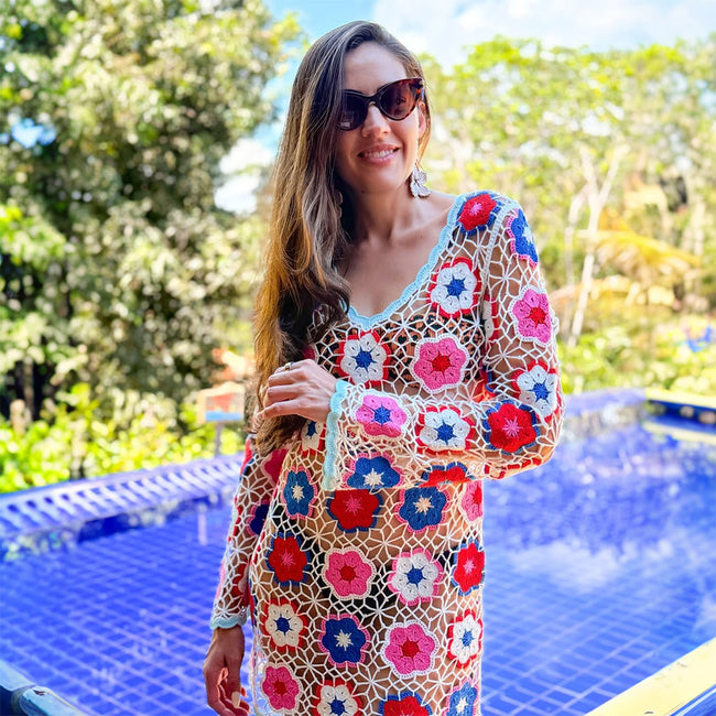 This crochet cover-up is gorgeous and perfect for summer. The colors are bright and vibrant, and the handmade style gives it a fun boho vibe that works great for the beach or pool. The material is light and breathable, so it’s very comfortable in hot weather. It hangs nicely, provides just the right amount of coverage, and looks stylish at the same time. Perfect for vacations, pool parties, or festivals, It’s a unique piece that really makes a beach outfit stand out.