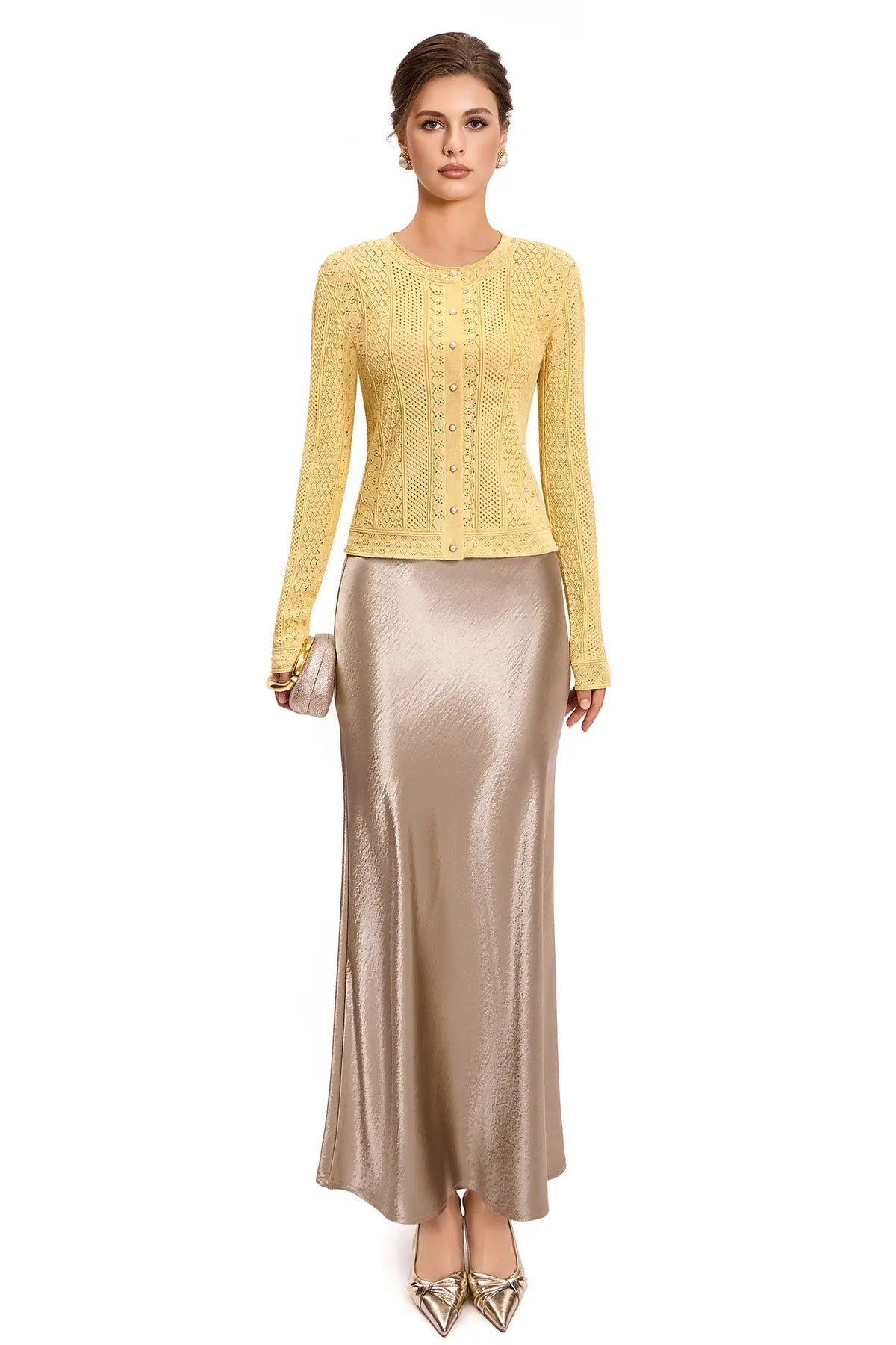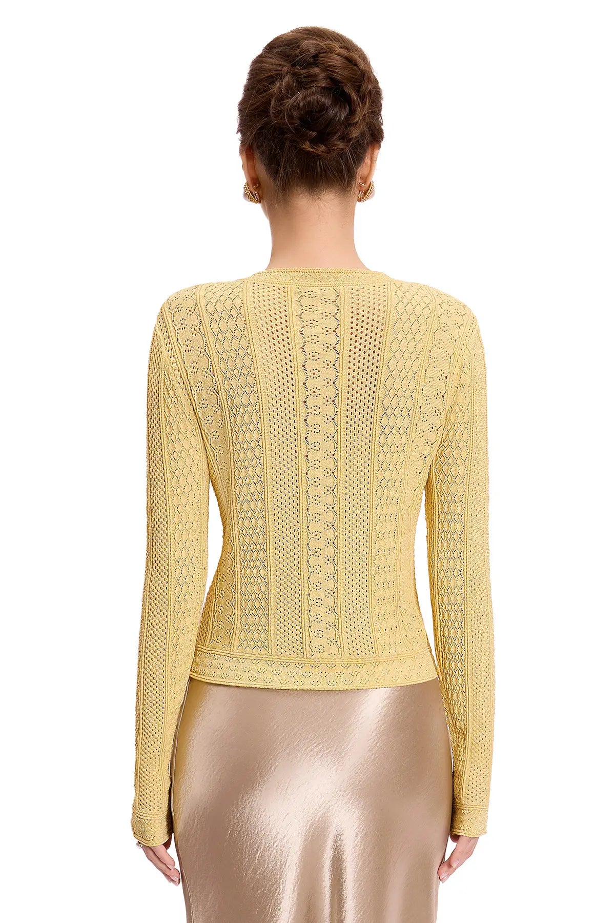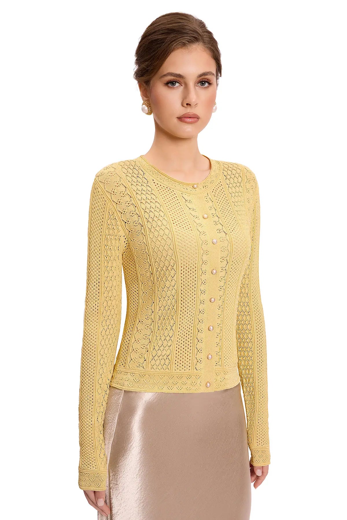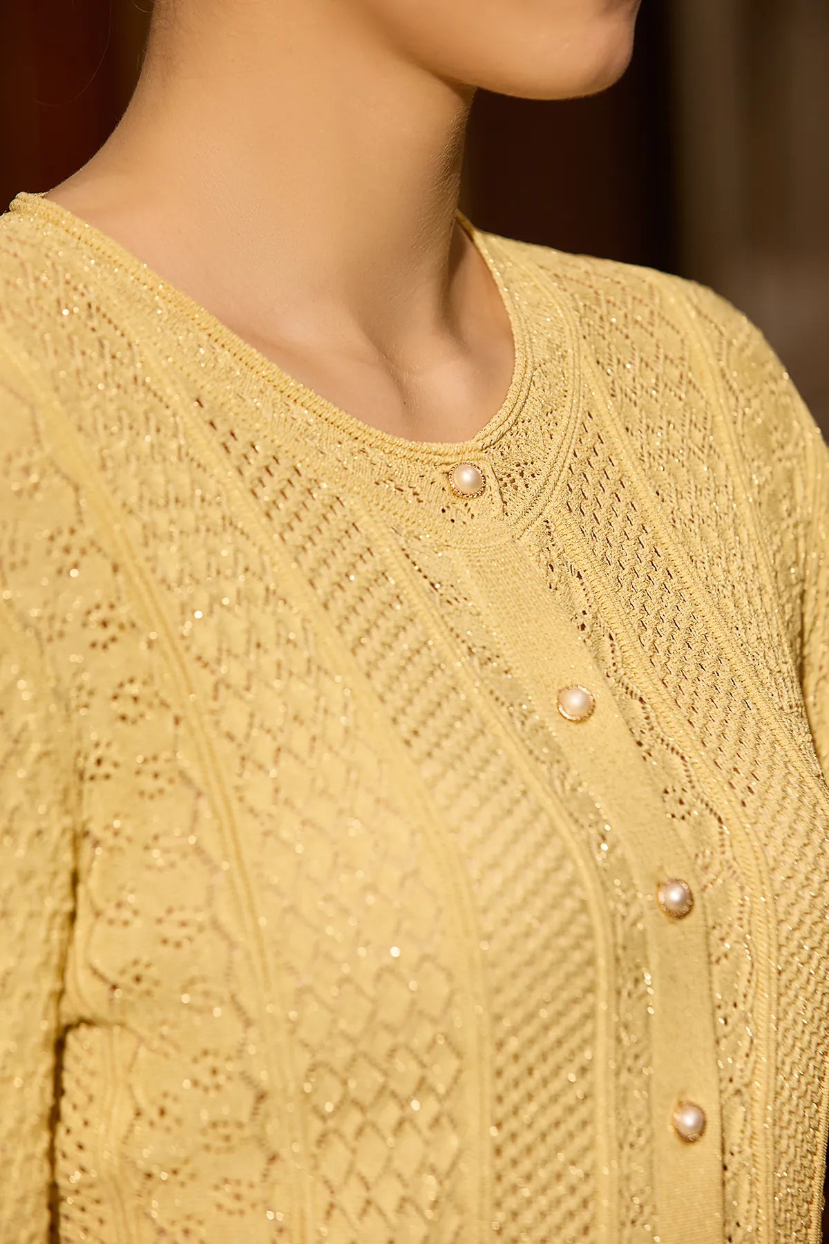 PACKAGING & PRESENTATIONThis comes packaged in an 11.75" x 14" bag made of velvet-like fabric (see photo). It's nice enough that I plan on keeping it to reuse for storing other things.MATERIAL & CONSTRUCTIONThe description says cotton with gold thread. Yes, there is gold thread that adds a subtle glimmer to the piece that you can't see very well in the product description photos. Hopefully you can see it a little better in the photos I've uploaded. The rest is cotton crochet. The item I have has no stitching or construction flaws, and is a well-made piece.COLOR ACCURACYI got the apricot color in size small. "Apricot" makes you think this is going to be a peachy color, but I'd say it's an off-white. The photo for apricot shows the item as it is - off-white. Trust the photo and not the color name for the apricot version.DESIGN DETAILSThe button closure is a round pearly button with metallic trim (see photo). It looks elegant and is a nice touch. The product description says that this piece has "Vintage Elegance with a Modern Fit," and I agree - it does feel vintage, but not necessarily with "old-lady" vibes.FIT & SIZINGAt 5'1" and 125 lbs, the fit of the small is a little snug around my upper arms, and the sleeve length extends almost to my knuckles. However, looking at the models in the product description photos, it seems the sleeves are meant to be that way. It otherwise looks nice on, and my husband actually said he likes it. He doesn't like anything.CARE INSTRUCTIONSThere are no care instructions on the label, but the product description does say to "hand wash in cold water and lay flat to dry." Given the delicate crochet construction, this seems necessary to maintain the shape.VALUE ANALYSISThis seems a fairly price to me at $80. I think it worth of what you're getting. Yes, the construction is nice and the details are elegant, but it's still a cotton machine-crocheted cardigan.STYLINGThe description suggests layering it "over a silk dress for evening parties" or "over a blouse for a professional office look." It does seem like it will work well as a layering piece for dressier occasions, but I plan on pairing it with jeans and wearing a camisole underneath for more casual occasions.FINAL VERDICTThis is a beautiful crochet cardigan with nice construction and elegant details. The gold thread adds a subtle glimmer, the button is a lovely touch, and the vintage pattern looks sophisticated. The fit is good (though snug in the upper arms for me). If you love the style and don't hesitate, it's a pretty piece that will dress up your wardrobe.