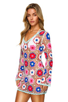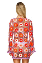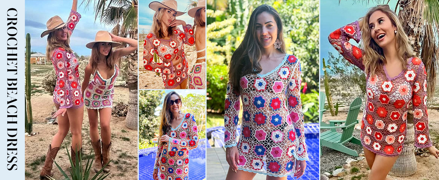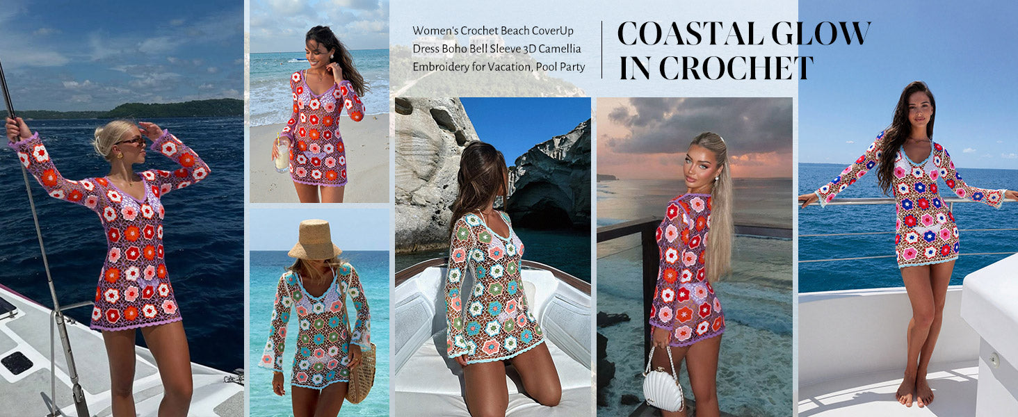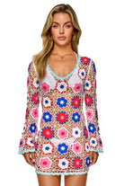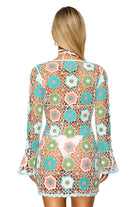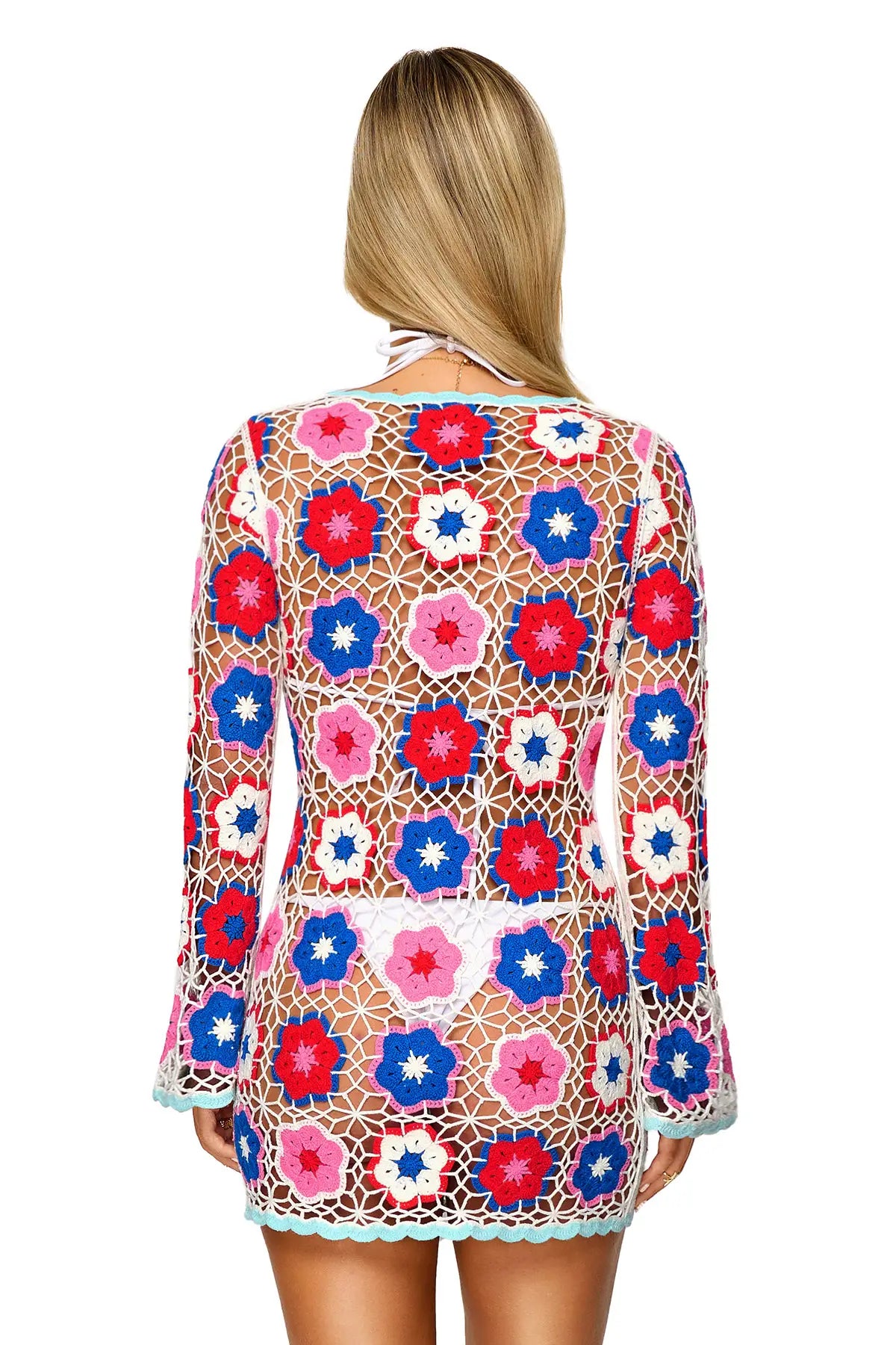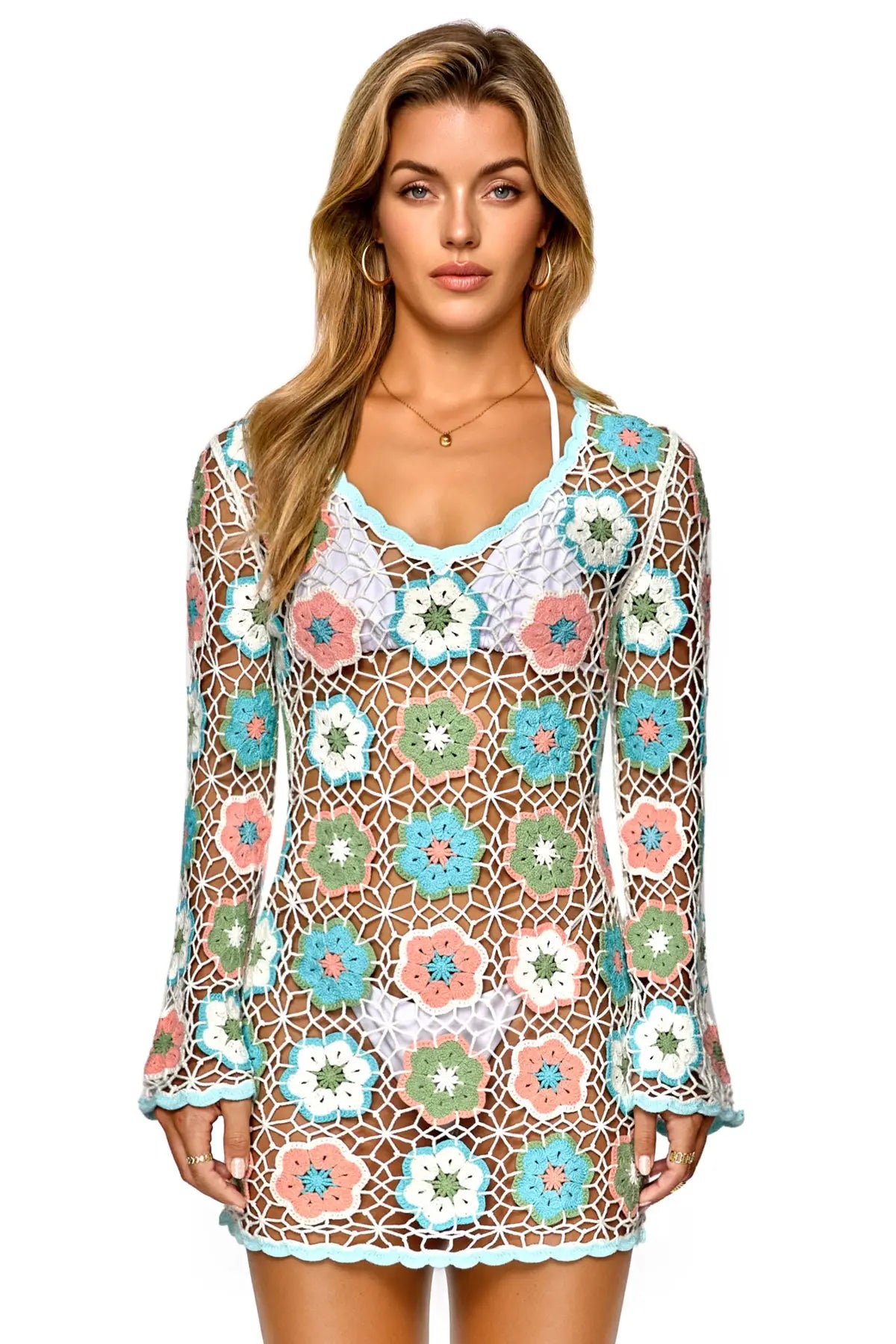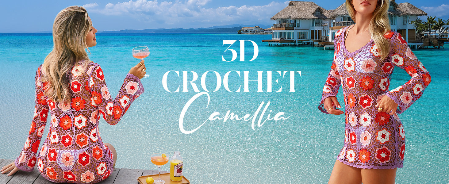 Adorn yourself in a bloom of artistry with this exquisite crochet cover-up, where delicate 3D camellia embroidery meets a vibrant, bohemian design. Featuring a deep V-neck and graceful bell sleeves, each piece is lovingly crafted to become wearable art that transitions effortlessly from sun-drenched afternoons to romantic resort evenings.