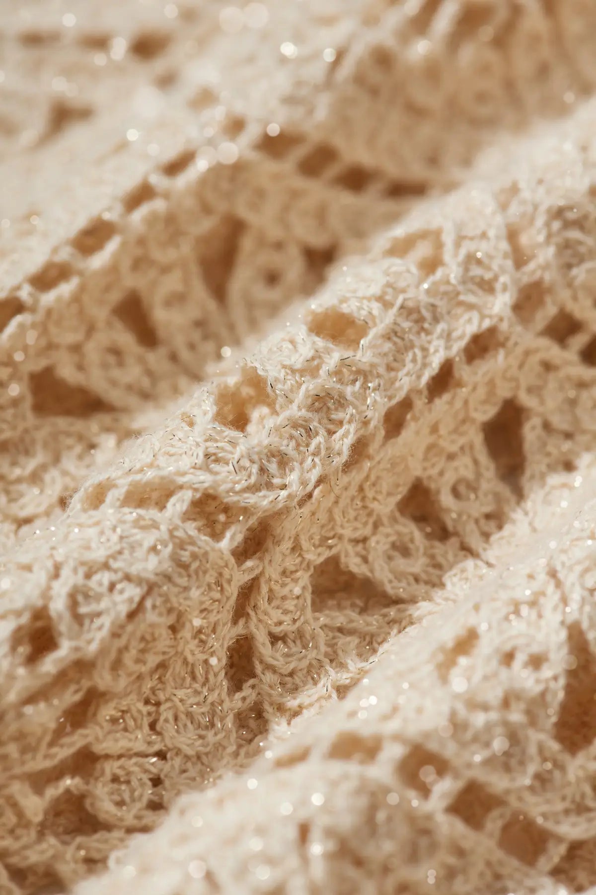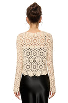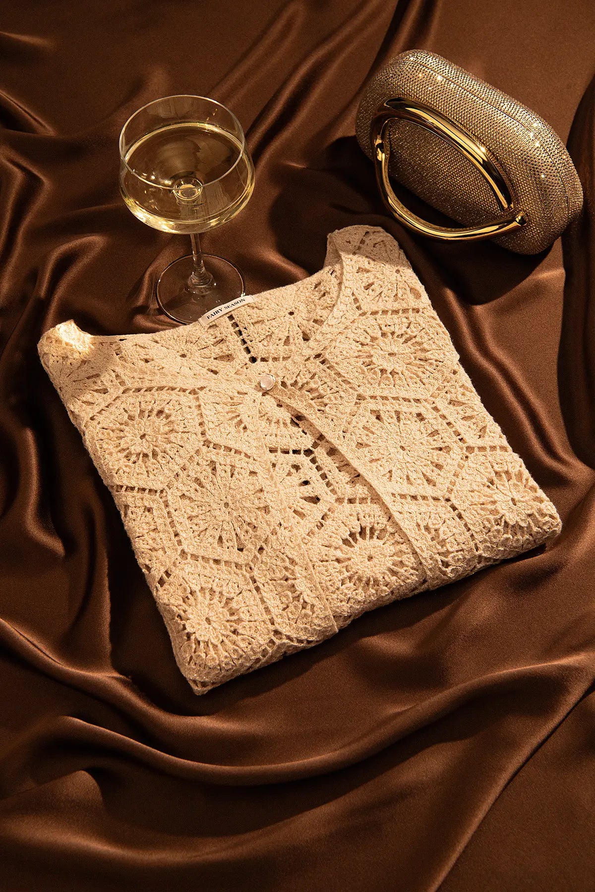 Effortlessly blend vintage charm with modern elegance in this cropped cardigan, featuring delicate hexagonal crochet motifs and a flattering one-button design. Woven with subtle gold yarn threads, the 100% cotton fabric offers breathable comfort and a touch of refined shimmer, making it a versatile layer for every season.