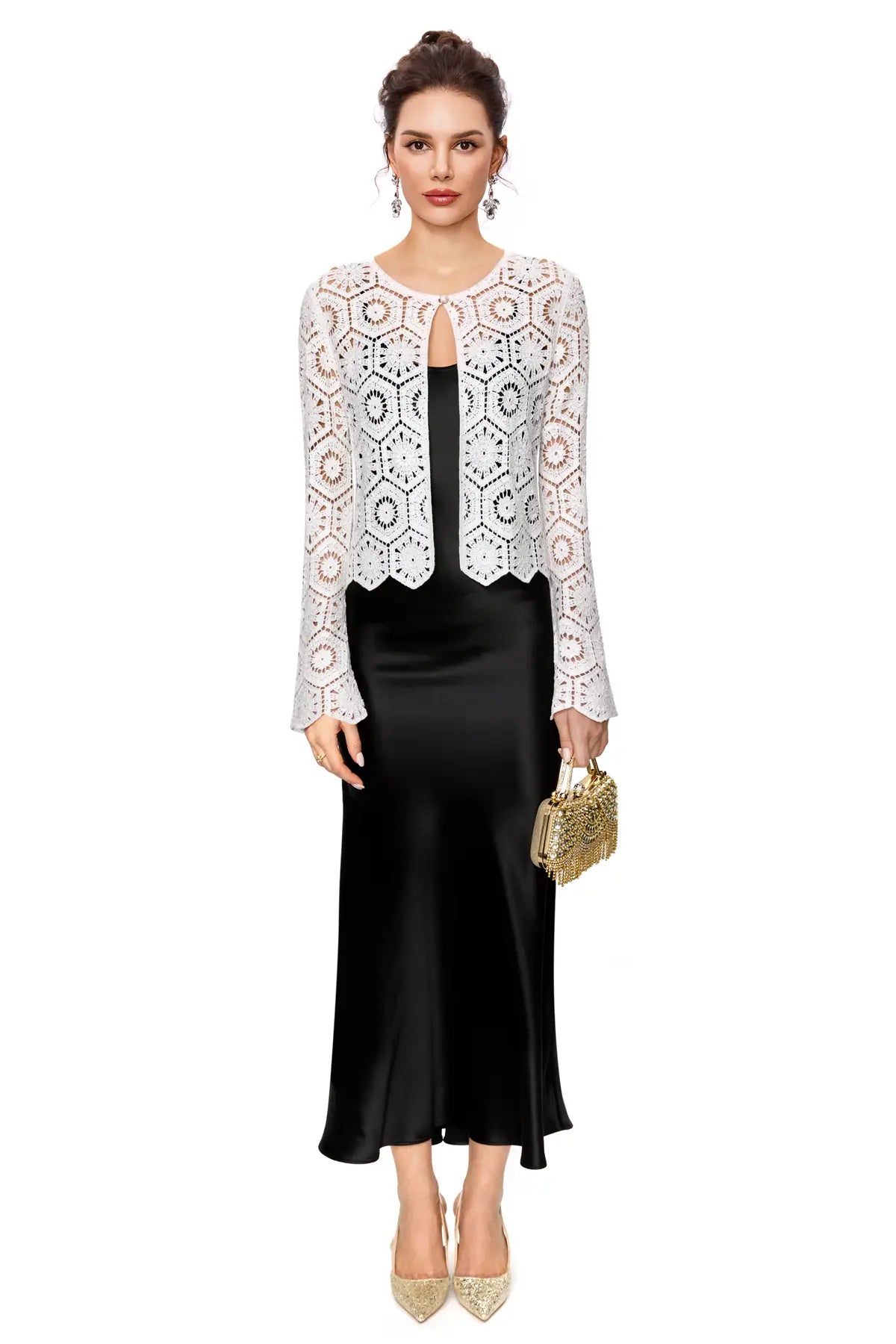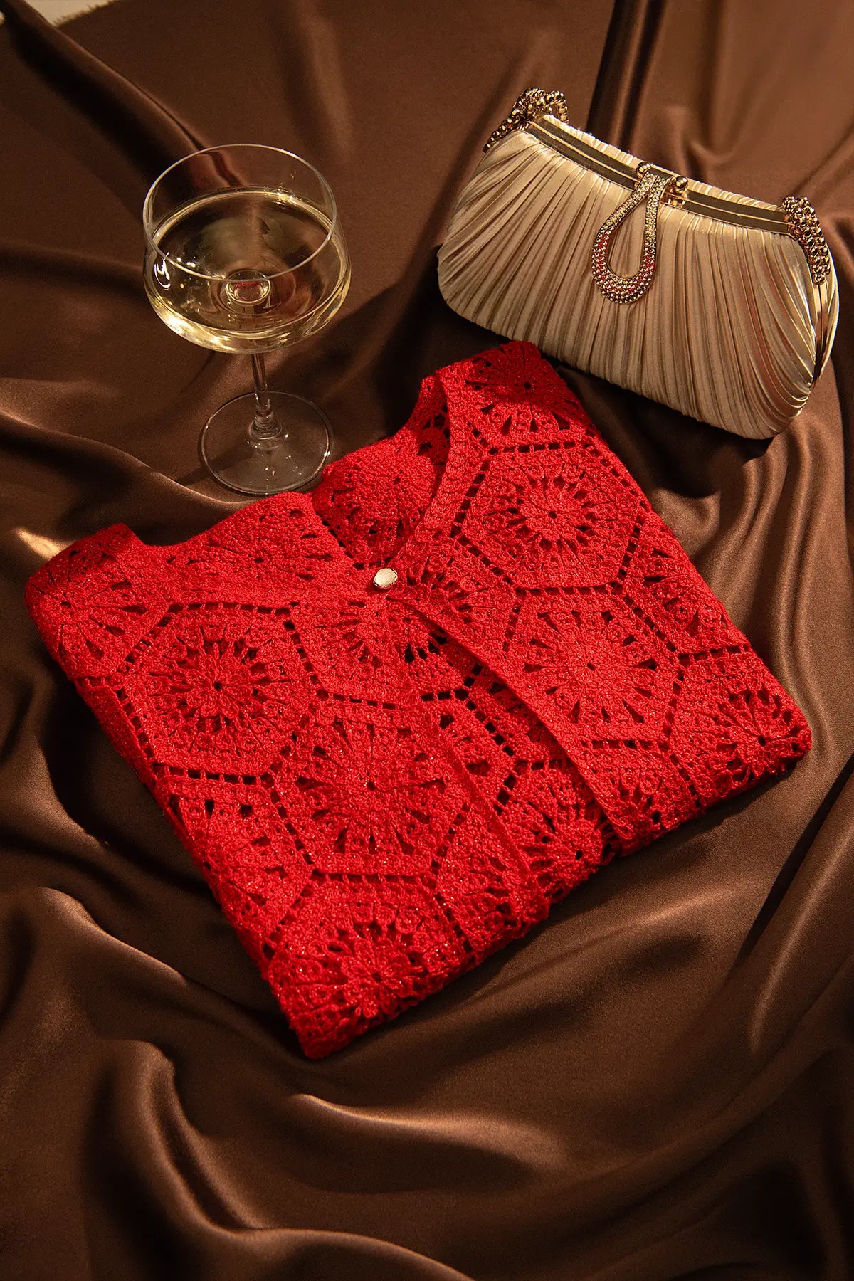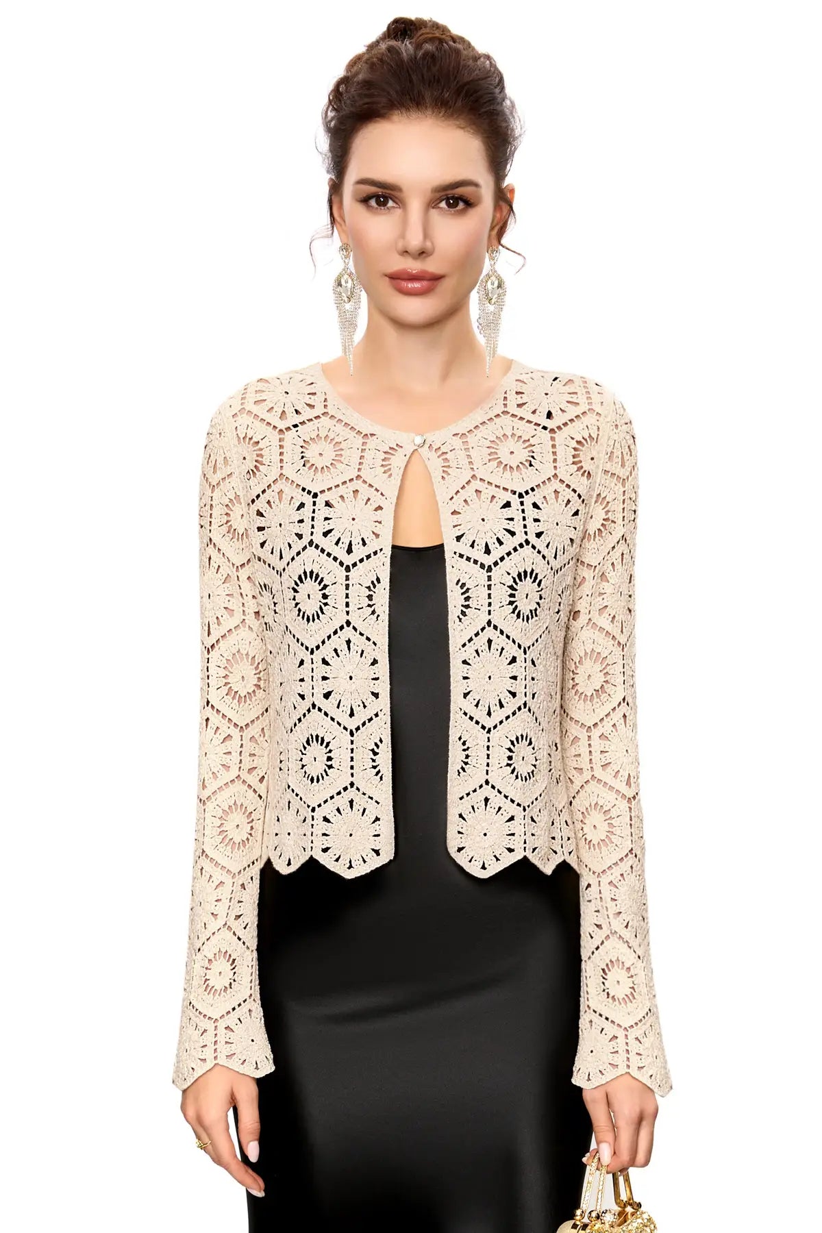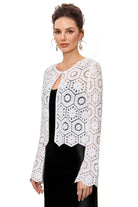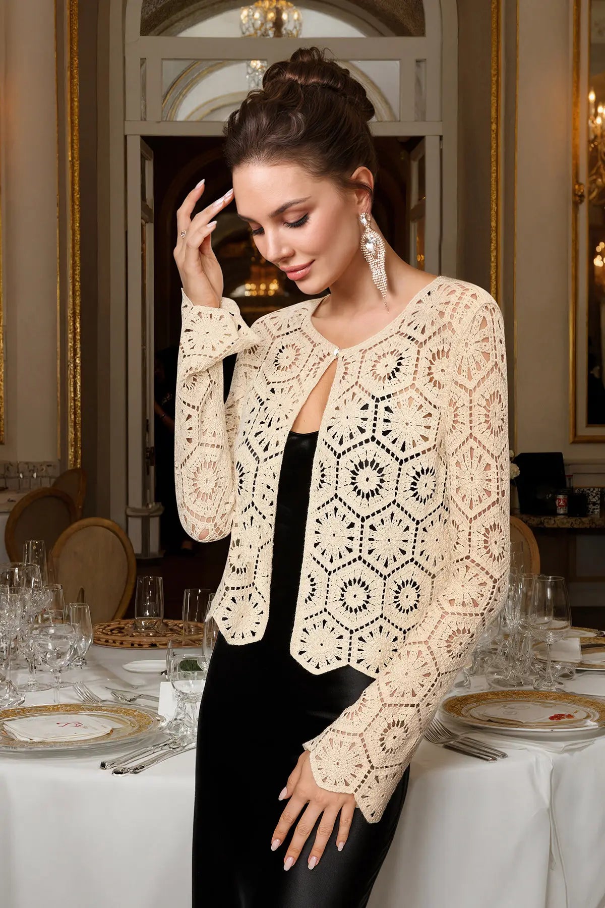 Designed with precision-knit texture and intricate hollow-out details, this piece elevates any outfit—from silk dresses to casual wide-leg pants. Whether for a garden party, evening event, or everyday wear, it’s a lightweight, artful essential that celebrates timeless femininity.