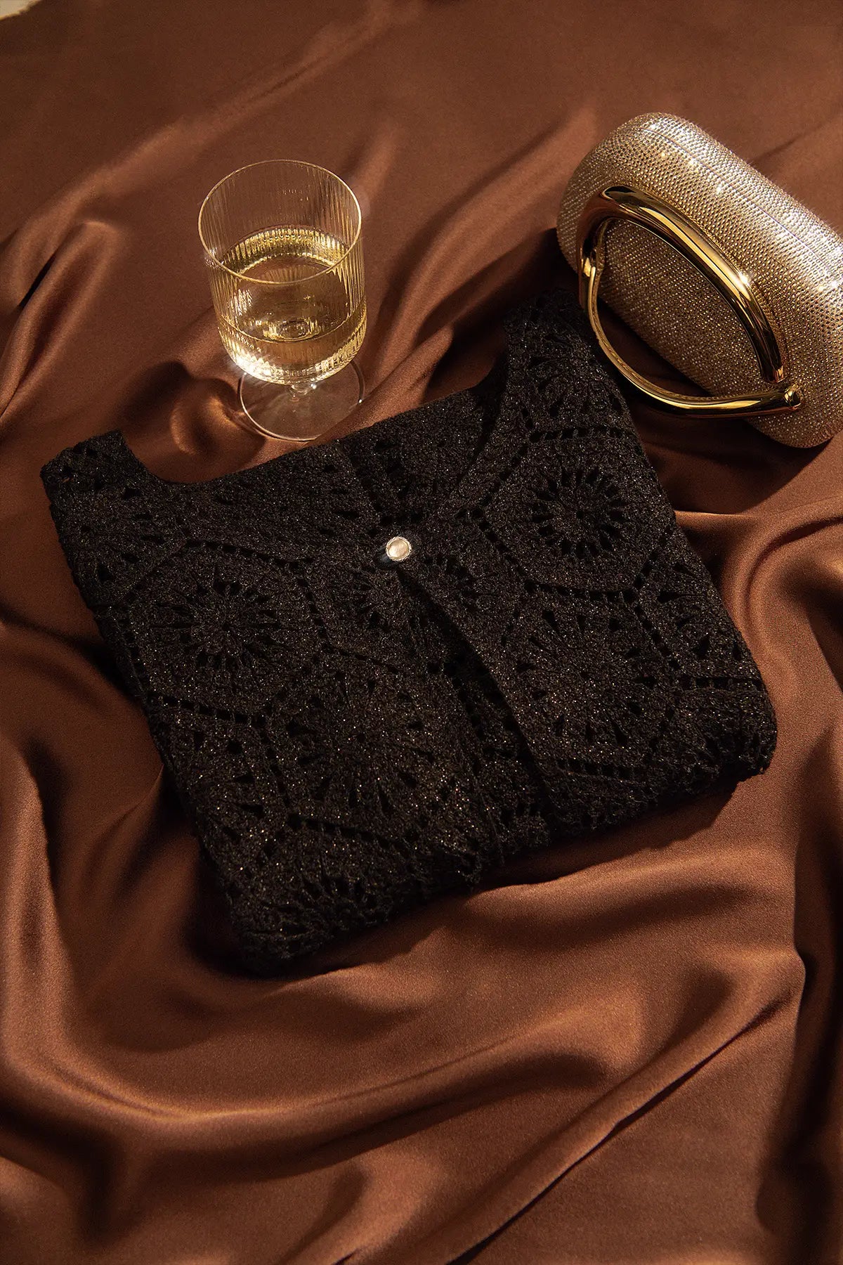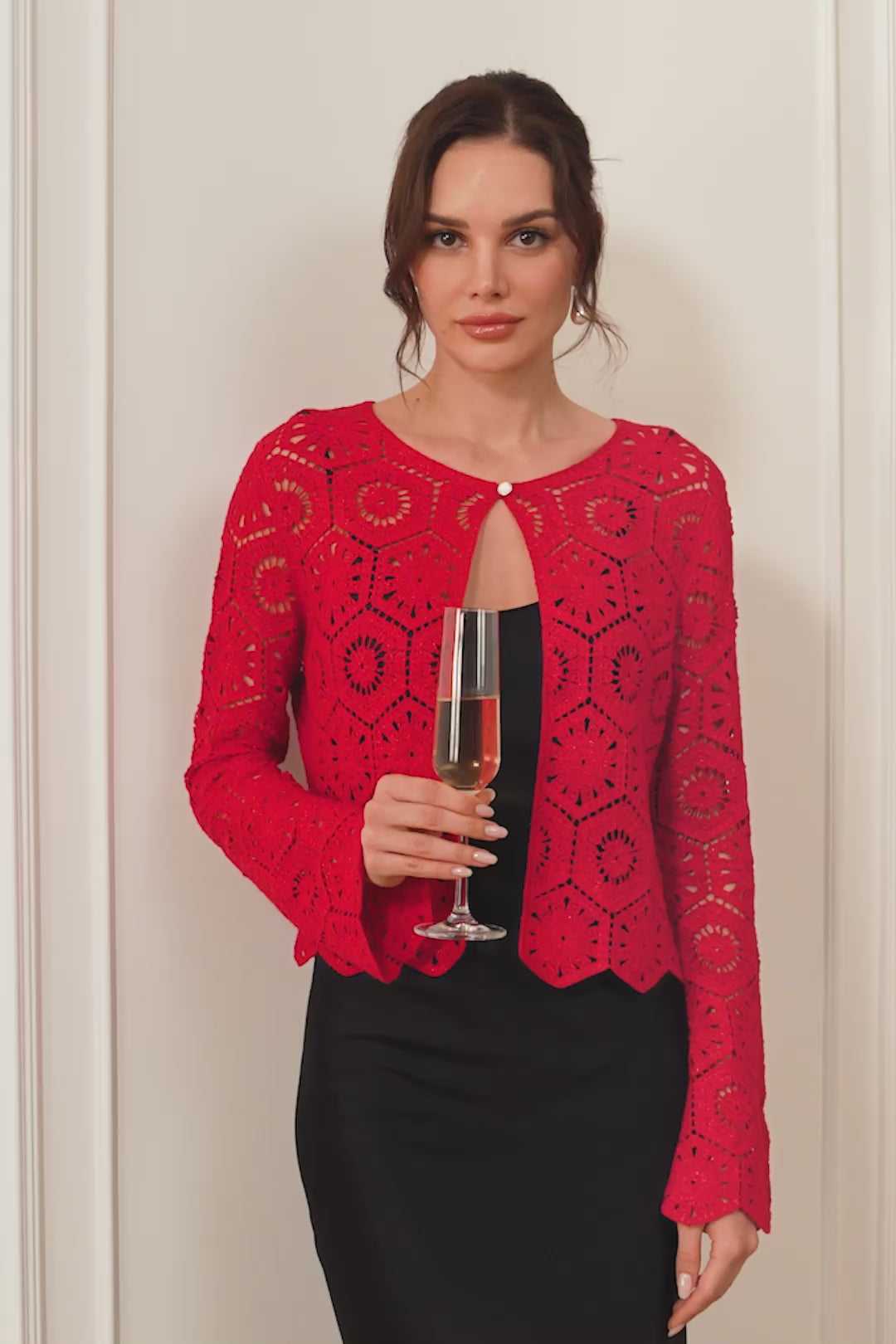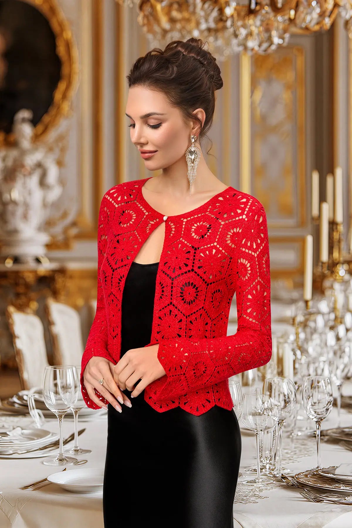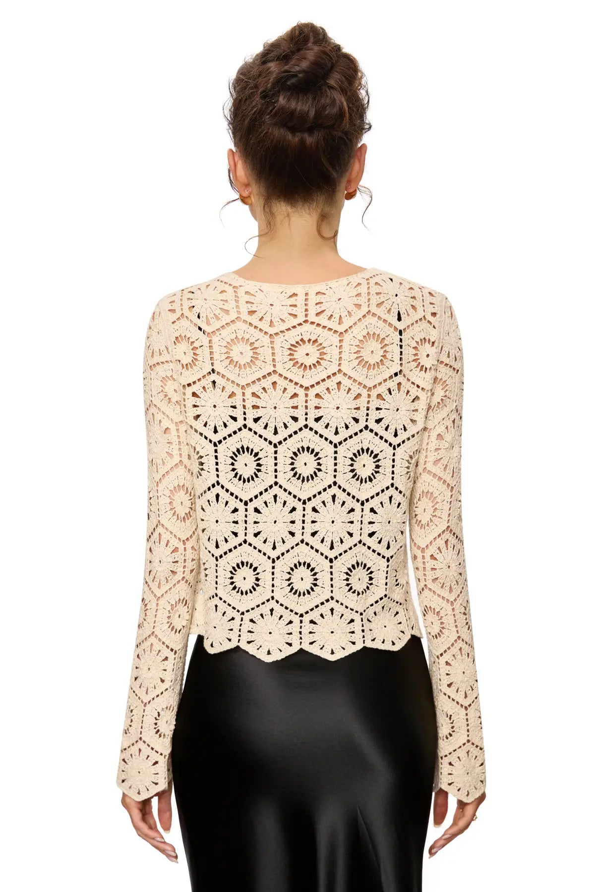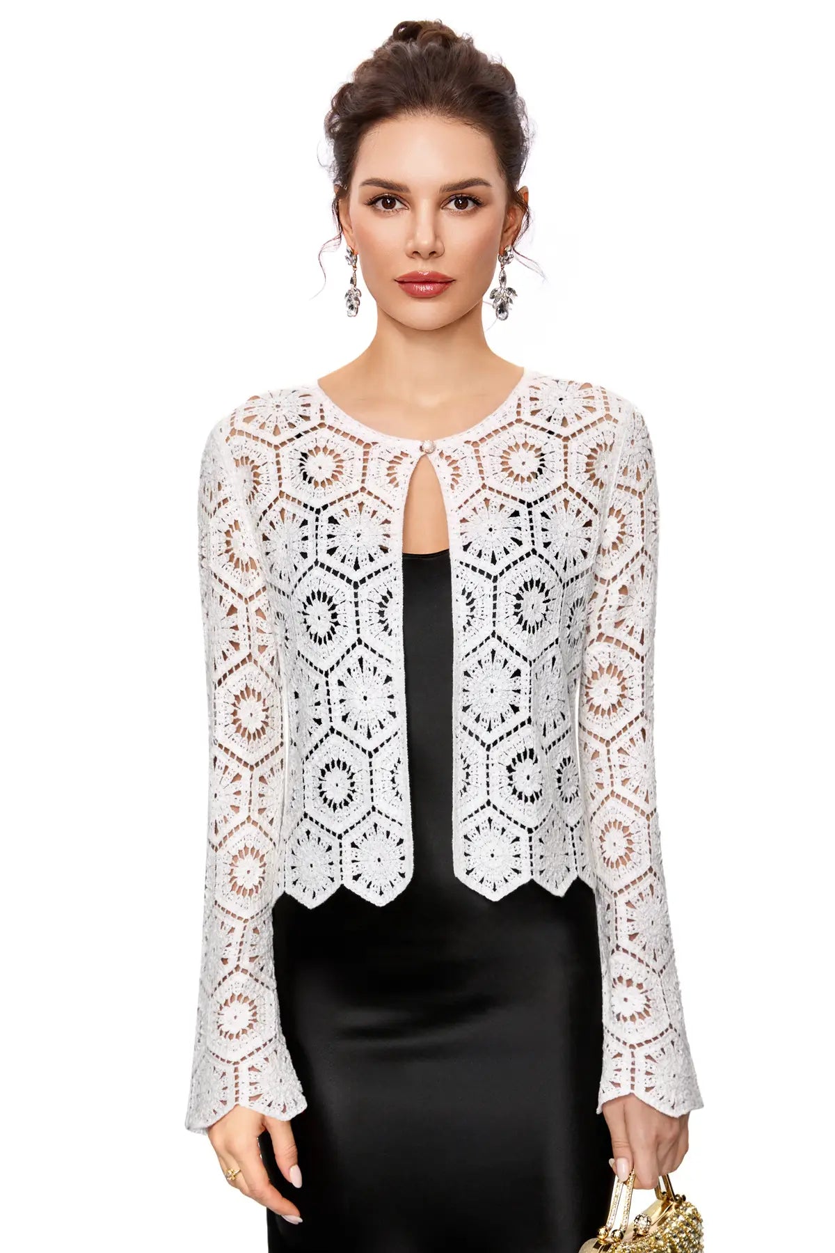Designed with precision-knit texture and intricate hollow-out details, this piece elevates any outfit—from silk dresses to casual wide-leg pants. Whether for a garden party, evening event, or everyday wear, it’s a lightweight, artful essential that celebrates timeless femininity.