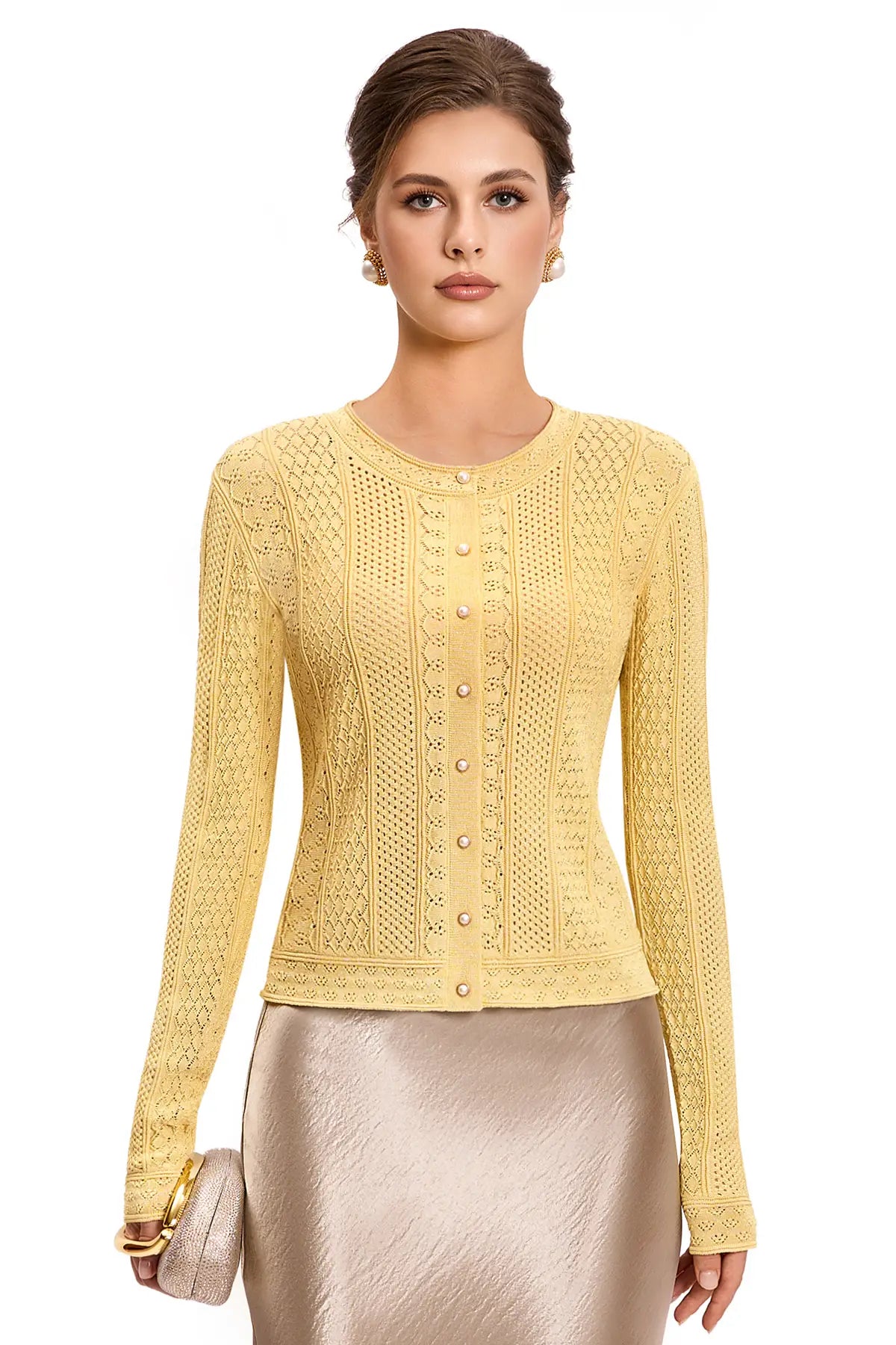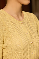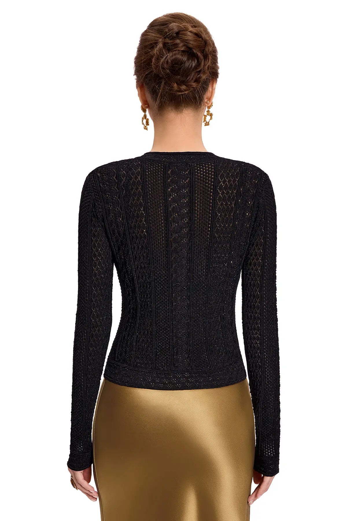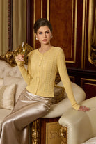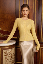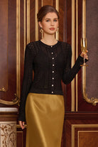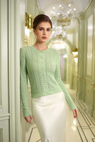 Step into a narrative of elegance with this Victorian-inspired cropped cardigan, where intricate openwork patterns meet delicate pearl buttons and woven gold thread. Each detail is a deliberate homage to courtly refinement, transformed into a wearable piece of art for the modern wardrobe.