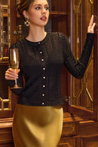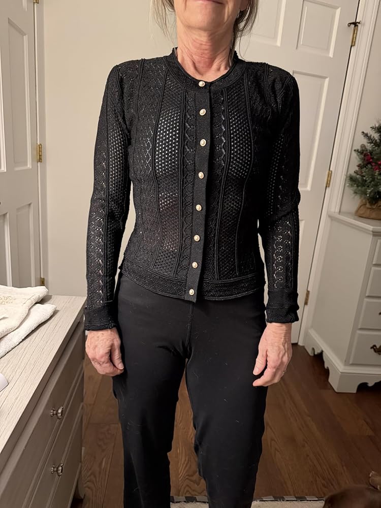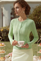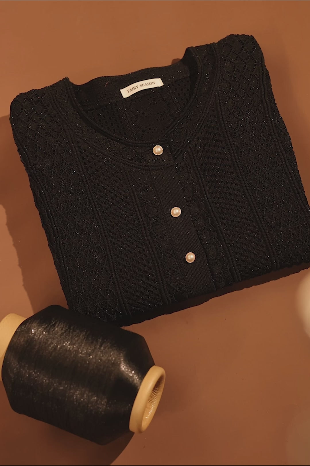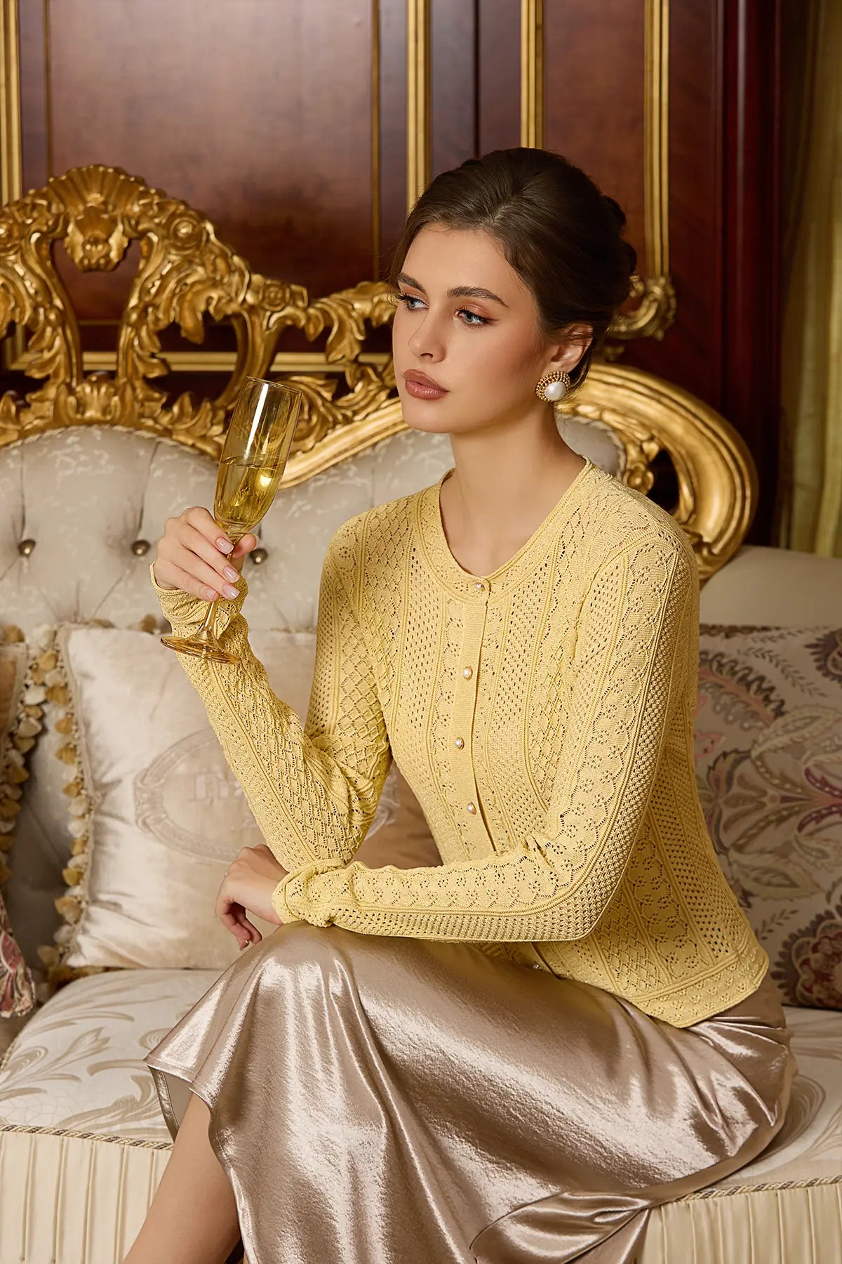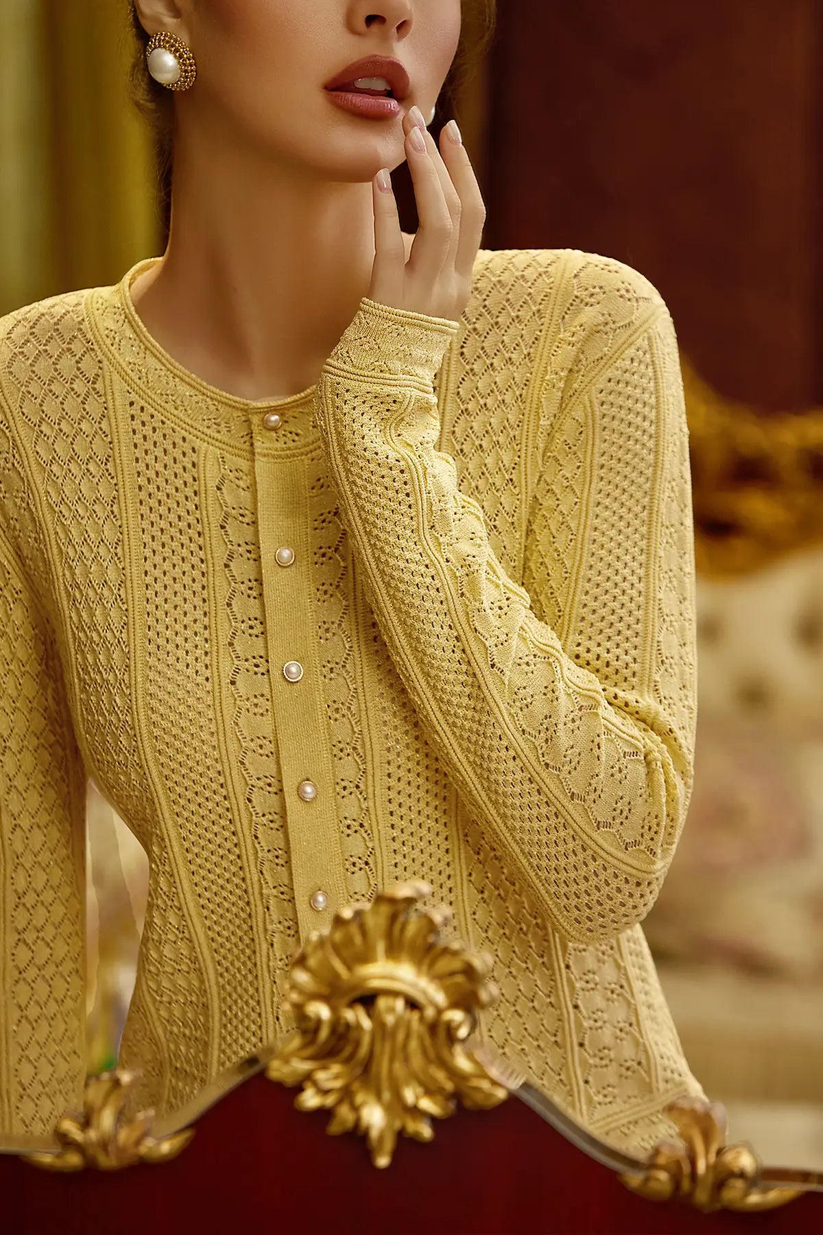 Step into a narrative of elegance with this Victorian-inspired cropped cardigan, where intricate openwork patterns meet delicate pearl buttons and woven gold thread. Each detail is a deliberate homage to courtly refinement, transformed into a wearable piece of art for the modern wardrobe.