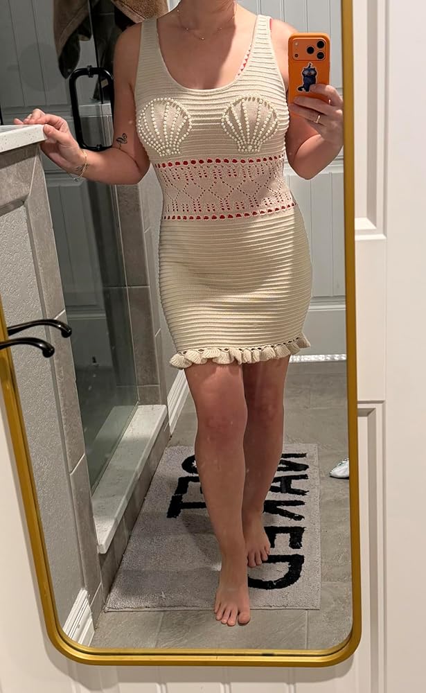 My favorite part of this beach dress is the seashell form on the chest and the pearls on it. The craftsmanship is truly much better than I expected. The open-work crochet detail at the waist shows off the body beautifully, and the ruffles at the hem add a very sweet vibe. The fabric is soft and stretchy, so it fits perfectly without being too tight. The champagne/ecru color looks amazing on tanned skin. It can be easily used not only at the beach but also at poolside parties or for seaside walks.