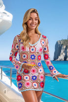 Adorn yourself in a bloom of artistry with this exquisite crochet cover-up, where delicate 3D camellia embroidery meets a vibrant, bohemian design. Featuring a deep V-neck and graceful bell sleeves, each piece is lovingly crafted to become wearable art that transitions effortlessly from sun-drenched afternoons to romantic resort evenings.