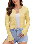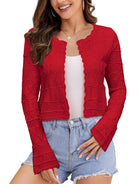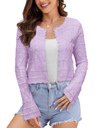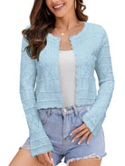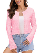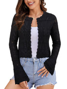 Experience cloud-like comfort in this beautifully cropped cardigan, designed with delicate crochet accents and graceful bell sleeves. Its lightweight fabric drapes effortlessly, making it the perfect elegant layer for transitioning between seasons and occasions.