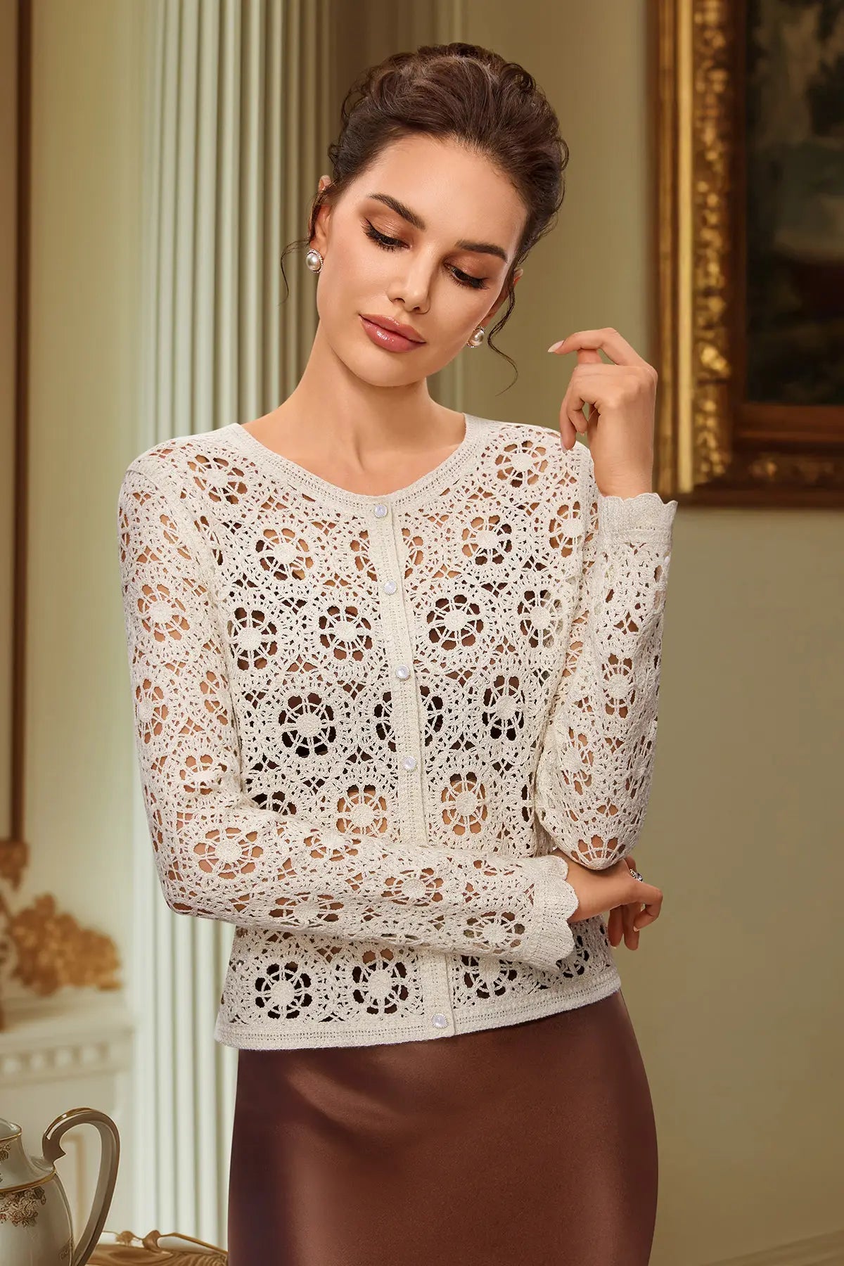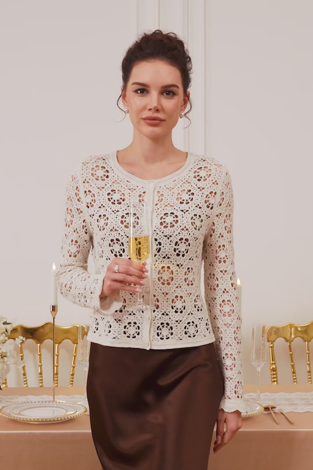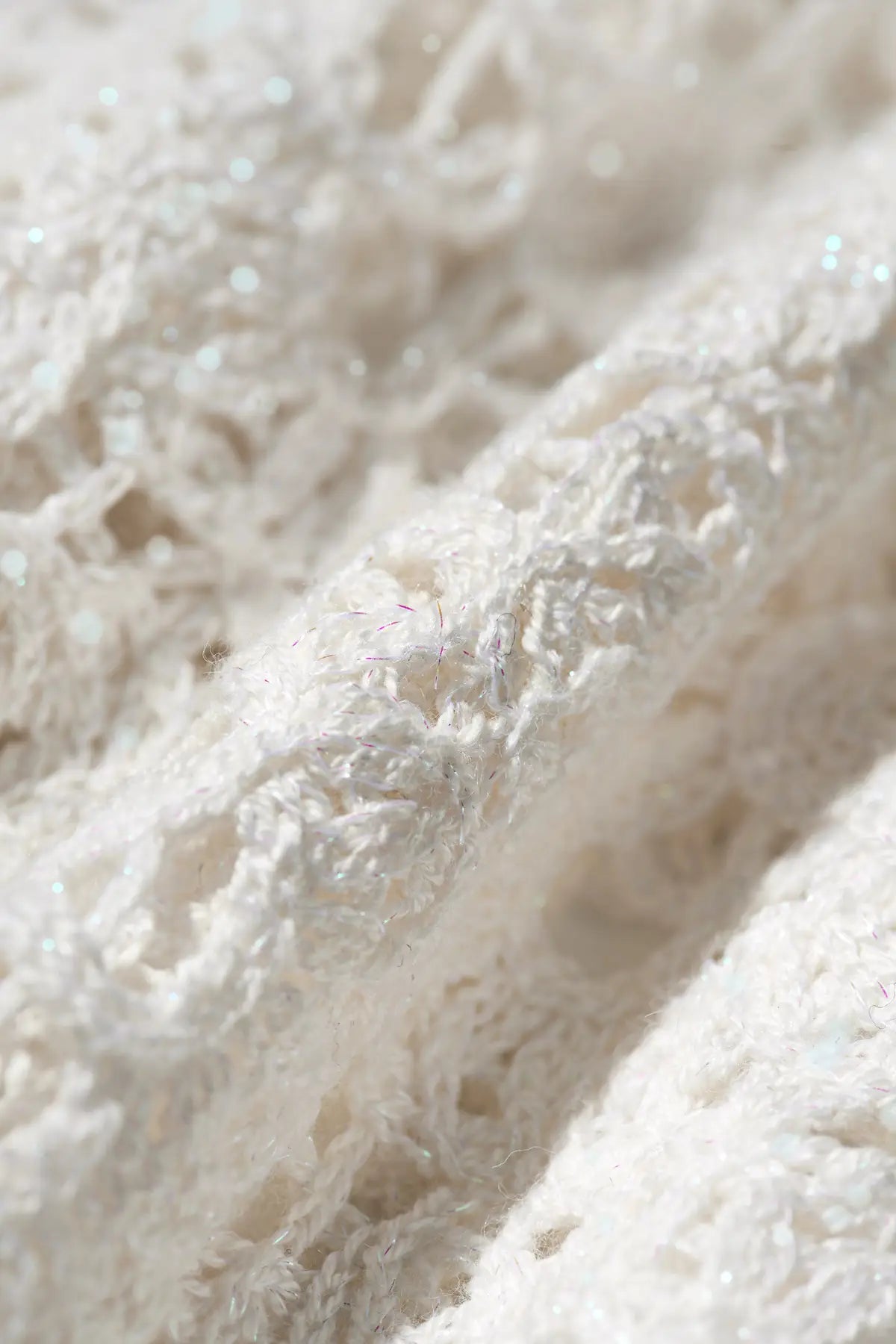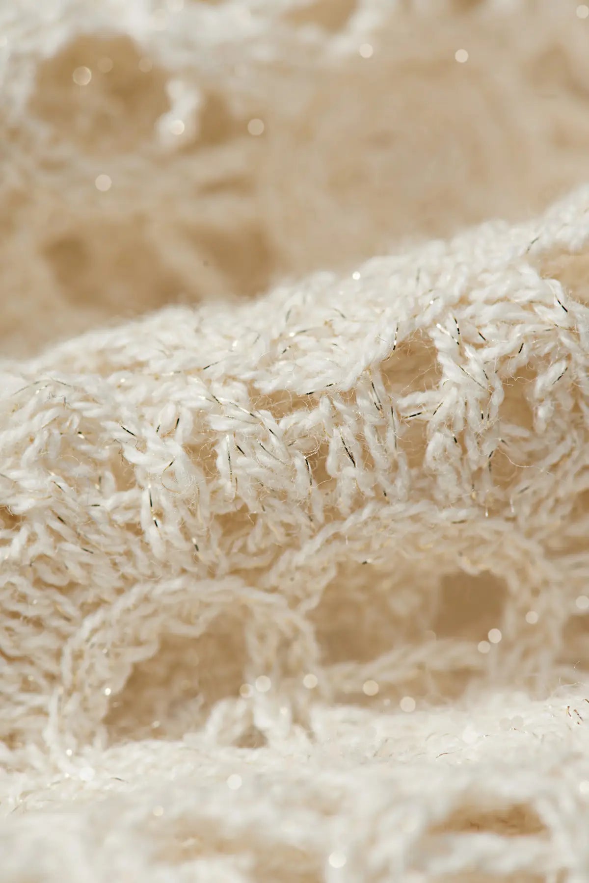 Adorn yourself in timeless elegance with this vintage-inspired crochet cardigan, delicately woven with golden threads for a touch of understated luxury. Its cropped, open-front silhouette offers effortless versatility, transforming any outfit into a statement of refined artistry.